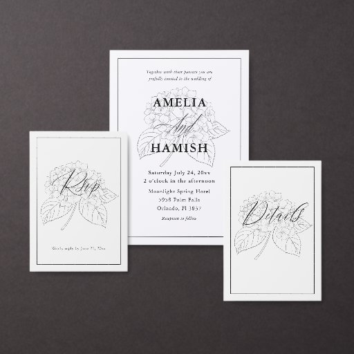 This timeless wedding details card features refined black typography on a crisp white background, paired with a delicate hand-drawn hydrangea illustration. Designed to coordinate seamlessly with modern, minimalist, and classic wedding stationery suites, it’s perfect for sharing reception, accommodation, and website information with guests. Clean, elegant, and effortlessly sophisticated, this card can be fully customised to match your wedding day details.