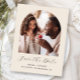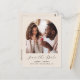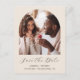 Den här enkla, minimalistiska boho Spara vykortet för datum innehåller ett bågformat foto ovanför orden "Spara datum" i ett vitt handskriftsskript för elegant, följt av parets namn, bröllop datum och stad i sans serif-teckensnitt på en beige bakgrund. Lägg till returadressen tillsammans med ytterligare information på baksidan.
