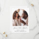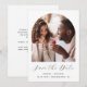 Den här enkla, minimalistiska Spara datumkortet innehåller en boho-fotobåge ovanför orden "Spara datum" i elegantens svarta handskriftsskript, följt av parets namn, bröllop datum och stad i sans serif-teckensnitt på vit bakgrund. Lägg till ett mer detaljerat meddelande med ytterligare information om det omvända.
