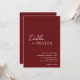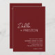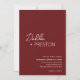 Modern burgundi alla i en bröllopsinbjudan med en enkel och minimal design med bridens namn i ett elegant-skript och brudgummens namn i en contemporary sans serif-typsnitt. Nedan i det nedre hörnet av högerna finns dina händelsedetaljer i en minimalistisk layout. På baksidan finns ytterligare information och QR-kod, så att du kan hoppa över kortet och OSA kort.
