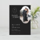 Ett tidlöst, klassiskt och elegant bröllop spara-to-date-kort med ett modernt, minimalt estetiskt i klassisk svartvitt. Enkel vapensköld i eleganten med enkel typografi i modern form. Fotot visas i ett unikt foto ram för att matcha parets monogram-vapensköld. **All färger kan ändras till kostym enligt bröllop färg. Kolla in våra andra matchande bröllop-objekt för den här samlingen.