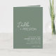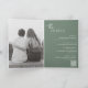Modern oliv grönt-/veckobild bröllopsinbjudan med en enkel och minimal grönt med bridens namn i ett elegant-skript och brudgummens namn i en contemporary sans serif-teckensnitt. Nedan i det nedre hörnet av högerna finns dina händelsedetaljer i en minimalistisk layout. Insidan har ditt favoritfoto och ytterligare information, inklusive en valfri QR-kod (om du föredrar det kan QR-koden tas bort i verktyg för designredigering). Baksidan har ytterligare två valfria avsnitt för mer information.