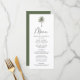 Tropical bröllop-meny med en enda handflatan träd överst på designen med "Menu" som visas i ett modernt svart kalligrafiskt skript. Anpassa menyn handflatan träd bröllop med namn, datumet bröllop och menyn nedan. Bröllopsmenyn återgår till en mörk grönt bakgrund med utrymme för ytterligare text och foton. Designad för samordning med vår insamling av minsta möjliga Handflatan Träd bröllop.