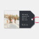 En snyggt modern märkre för fotopresenter i helgdag med ett modernt, minimalt typografiskt citat "årets mest underbara tid" parade med ett handskrivet typsnitt för din familj namn i vitt med en blåaktig svart fläkt färg i en skandinavisk design i stil. Hälsning och namn kan lätt anpassas för personligt bruk. Ett trendig, minimalistiskt och contemporary för att visa ut den här julhelgen! Bilden som visas är endast avsedd som illustration för att ersättas med ett eget foto. Platshållarbilden består av en ung familj med fyra leker i snö med träsled och gräs träd.