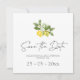 Minimal Lemon Grönska Spara datum-kort - Meddela din stora dag med detta minimalistiska spara datum-kort med en delikat citron och grönillustration. Den rena designen och mjuka färgpaletten gör det perfekt för medelhavs-, sommar- eller utomhusbröllop.