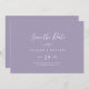 Det här minsta vågrät för löv lavender att spara datumkortet är perfekt för en boho bröllop. Utformningen har en enkel grey löv silhouette i pastelllilak lila med minimalistisk bohemisk trädgård stil.