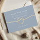 Elegant, minimal, modern typografi, dammig blå bröllop spara datum-inbjudan, med guld-rep hjärta och enkelt handskrivet skript.