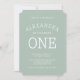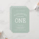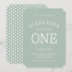 Modern minimal och könsneutral första födelsedagsfest inbjudan i mjuk grönt, vismisk typografi och en roligt polka punkt mönster på baksidan. Fullständig anpassade 1:a födelsedagskortmall.