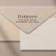 Returadress frimärke med en klassisk serif-typografi i namn och adress med minimala moderna bokstäver.