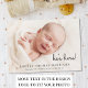 Minimal information om foto för att meddela att baby kommer till familj och vänner. Ditt nyfödda foto fyller framsidan och är överlagrad med "hon är här!" "Han är här!" eller "Jag är här!" i ett skript för contemporary (du kan flytta texten till ett annat område på kortet beroende på fotot genom att välja "redigera i designad verktyg"). Lägg till hans eller hennes namn, ankomstdatum och födelsestatus nedan. På motsatt sida lägger du till ytterligare fyra familjefotografier, ett "välkomnat av"-meddelande och föräldrarnas och syskon först namn.