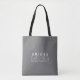 Denna brudtärna tote-väska har en minimalistisk design med ett fet och ett kontur sans serif-teckensnitt på framsidan och ett komplementärt serif-teckensnitt för namnet. Lägg till namn genom att klicka 'personifiera', och för att ändra färgen på texten eller bakgrunden, klicka " Anpassa ytterligare" för att gå till designverktyget.