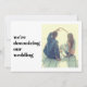 Ett minimalistiskt modernt bröllopsanmälningskort för att låta de på din ursprungliga utökade gästlista veta att omständigheterna har gjort att du måste minska storleken på ditt bröllop. På framsidan skrivs "vi minskar vårt bröllop" i modern typsnitt bredvid ditt favoritförlovningsfoto. På baksidan kan du anpassa ditt meddelande mer detaljerat och lägga till eventuell livestreaming, framtida firanden och information om bröllopswebbplats.