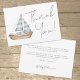 Ahoy, det är en pojke! Nautical Baby Shower Folded (Nautisk babyskor) - ett tackkort. tacksamhet med denna enkla och minimalistiska nautiska plan. På framsidan finns en söt vattenfärgssegelbåt med blå och vit stripe på den lämnat, med "Tack!" på högerna i ett vanligt handskrivet grått-skript, allt mot en ren vit bakgrund. Inuti finns det en förskriven anteckning med mamma till namn, som du kan anpassa eller ta bort om du föredrar att skriva ditt eget meddelande. Texten användor en blandning av handskrivet manusgrafi och klassiskt serif typsnitt i mjuka grått-toner för ett mjukt, modernt utseende. Kortets baksida är en mjuk dammblått som ger en lugnande nautisk beröring. Du kan justera texten, färg och typsnitt helt och hållet anpassadet så att de passar evenemangets vision. Idealisk för en pojkdusch med ett nautiskt tema, tillför det vikta kortet ny och snyggt charm till firande. Tillgängligt som utskrivet kort eller digital nedladdning.
