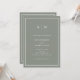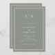 Den här eleganten, som alla är i en bröllopsinbjudning, har en enkel grönt och vit minimalistisk textdesign, med ett klassiskt ram vid gräns. Lägg till initialer eller monogram för att göra dem helt egna. Baksidan av inbjudningsfunktionrummet för information om bröllop (mottagningsinformation, hotellrum osv.) och osa (inklusive en skannerbar QR-kod så att gästerna kan svara på online via din bröllop webbplats).