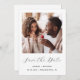 Detta enkla, minimalistiska Save the Date-kort har ett fyrkantigt foto ovanför orden "Save the Date" i elegant svart handskrift, följt av parets namn, bröllopsdatum och stad i sans serif-teckensnitt på vit bakgrund. Lägg till ett mer detaljerat meddelande med ytterligare information på baksidan.
