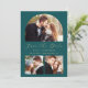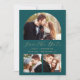 Den här enkla, minimalistiska Spara datumkortet innehåller en anpassningsbar fotobåge ovanför ord "Spara datum" i handskriftsskript för elegant guld färgad, följt av parets namn, bröllop datum och stad i sans serif-teckensnitt på en tealblå bakgrund. Två mindre, fyrkantiga foton visas grund på kortet. Lägg till ett mer detaljerat meddelande med ytterligare information på baksidan, tillsammans med en QR-kod som hjälper dina gäster att besöka webbplatsen för bröllop.