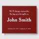 Denna minimalistiska begravning/minnesbok för minnesmärken innehåller budskapet "Vi kommer alltid att minnas den glädje du gav oss", och det anpassade datan namn och födelse/död för den person som har passerat vidare. Den användor en röd mörk och vit text. Den skulle kunna användas för att registrera omhuldade minnen från någon som nyligen har gått bort.