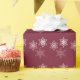 En enkel, men ändå minimal, elegant och festlig utformning med upprepade uppsättningar av tre vita snöflingor på kranbärsröd bakgrund.