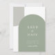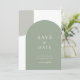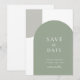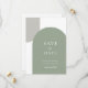 Sätt tonen för din bröllopsfest med detta minimalistiska "save the date"-kort med två valv. Ett enkelt salvia grönt valv och ett enkelt grått valv i hörnet. Den rena, retroinspirerade layouten ger en modern tolkning av elegant bohemisk stil, vilket gör den idealisk för par som planerar en utomhusfirande, gårdsbröllop eller intim sammankomst.