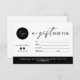 Ett minsta presentcertifikat för elegant med ETT GIFT FÖR DIG i handskrivet avslappnad-teckensnitt parat med ett klassiskt serif-teckensnitt med två social-ikoner (Facebook och Instagram) och utrymme för ditt social-konto. Längs grund, ett svart gräns med dina kontaktuppgifter för fullt i vitt. Vår presentcertifikatmall strejkor en perfekt balans mellan modern elegans och personlig branding. Du kan enkelt integrera din logotyp och se till att din varumärkes identitet skryter igenom. ALLA TILLGÄNGLIGA FÄRG Om du behöver ytterligare ikoner eller specifika ändringar, tveka inte att kontakta oss på citronelladesign@gmail.com innan du beställer din beställning. Alla företag som vill locka kunder, öka försäljningen eller skapa incitament för specifika åtgärder kan dra nytta av att använda presentkuponger som en del av sina marknadsföring och säljfrämjande åtgärder. Det är ett utmärkt val för restauranger och kaféer, Spa- och Hälsa-center, rese- och turismtjänster, presentkuponger för tjänster som massage, facials och hälsa-behandlingar.