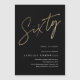 Modern minimalistisk 60-års födelsedagsinbjudan med stilrent falskt guld folie nummer handskriven skrift Sixty och din festinformation i klassisk serif-teckensnitt på svart bakgrundsfärg, enkel och elegant, fantastisk överrasknings inbjudan för vuxna till milstolpe födelsedag för män och kvinnor. den svarta bakgrundsfärgen kan ändras till valfri färg.