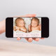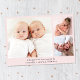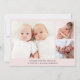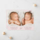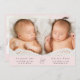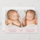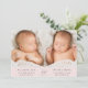 Minimal rosa-tvillingflickors foto-kollage-födelsemeddelande med foto-, namn, ankomststatus och födelsestatus i enkel, modern typografi. På motsatt sida lägger du till ytterligare tre foton och ditt "välkomnas av"-meddelande.