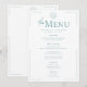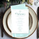 Slimmad, sofistikerad och smidigt elegant - detta moderna bröllop-menykort är perfekt för paret som inte har någon tidsmässig utformning med contemporary-vrid. Med mjuk turkos aqua på en ren vit bakgrund ramas layouten av ett tunt öppet gräns som lägger till bara högernas detaljberöring. Parets första namn går i centrum, teckning i öga, innan man ger gästerna information om evenemanget i ett minimalistiskt modernt typsnitt. En enkel konsthistoria lägger till en aning kustcharm. Skapat av Farmhouse Press.