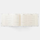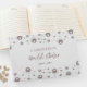 Modern och enkel bröllopsdusch gästbok med vit pärlrand och livlig kalligrafisk text.