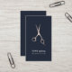 Elegant anpassningsbar affärsbokstavsmall med FALSKA metalsaxar och mörkblå bakgrund. Perfekt för frisörer, hår salonger.