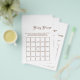 Celebrate the mom-to-be with this elegant Baby Shower Bingo game! This charming flyer features a delicate brown script font for the "Baby Bingo" title, set against a clean white background. The game instructions are clearly printed, inviting guests to guess the gifts the mommy-to-be will receive. The bingo grid is outlined in a sophisticated brown, with a sweet heart at the center, creating a lovely focal point. This design is perfect for a classic and timeless baby shower theme, adding a touch of grace to your celebration. Guests will have a blast playing this interactive game, making your baby shower memorable and fun for everyone.