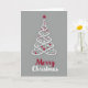 Beneath the tree, the words "Merry Christmas" are written in red cursive and white block letters, adding a festive touch. Shadows under the ribbons and ornaments create depth in the image. Overall, the card blends traditional holiday symbols with a contemporary feel, creating a serene and stylish atmosphere.