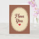 This card shows a tall cream-colored oval centered on a chocolate-brown background, giving it a cozy, classic look. Inside the oval, the words “I Love You” appear in smooth, flowing cursive lettering in a deep maroon color. A neat double border frames the oval, with a ring of tiny brown dots just inside a thin solid brown line. Beneath the words sits a single red heart, simple and bright, like a little reminder of what you’re trying to say ❤️. The warm browns and soft cream make the heart and message feel even more tender and focused. It’s the kind of design that feels steady and sincere, which can matter when you want your feelings to land without a lot of extra fuss. Giving this card says you care in a direct, comforting way, whether it’s for romance or a close friendship 🥰. Hope it helps you share your Valentine’s Day feelings in a way that’s easy and heartfelt.