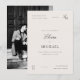 Spanish wedding invitations. An English-language version of this design is available in our store for bilingual weddings. This is a modern minimal wedding invitation card featuring an elegant timeless design, with clean lines and a focus on typography. This template combines script calligraphy and a classic serif font in a unique layout, there is a minimalist monogram in the top right-hand corner, and the background is an off-white ivory color. This chic "old money" design is ideal for formal, black tie, or luxury wedding events. Cards reverse to an engagement photo of your choice, we have chosen a black and white photo for this design, but you can remove the filter using Zazzle's Design Tool. Edit most wording and all colors to make this minimal wedding invite fit your event needs and personal style. View the collection linked on this page for the full wedding suite or visit our store for more wedding invitations. Invitación de boda en español con diseño moderno y minimalista. Con tipografía elegante, caligrafía, una foto de la pareja, y un monograma minimalista en la esquina superior derecha, perfecta para bodas formales.