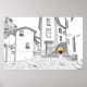 Bring a sense of calm wanderlust into your space with this minimalist illustrated European street poster. The artwork features a hand-drawn black-and-white old town scene with cobblestone streets and stairways, accented by a single figure in a light dress and straw hat for a soft, poetic contrast.