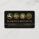 An all black cover with a faux gold line near the base of the card. Over at the top is an array of faux gold plumbing tools followed by the business name "PLUMBING & HEATING CO" which you can change. At the base are the contact details near the base.
