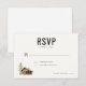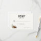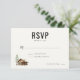 This wedding RSVP card features a minimalist and elegant design with ample white space, creating a modern aesthetic. The layout includes a rustic log cabin illustration paired with a tall pine tree in earthy browns and greens, adding a cozy natural theme. Bold serif typography highlights the "RSVP" text, while handwritten-style script adds a personal touch. Perfect for conveying warmth and simplicity, this card is ideal for couples seeking a stylish yet understated invitation response option.