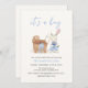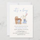Modern, minimalistisk "det är en pojke" daghemskduschtema för spädbarn, design med vattenfärgskanin i blå trasa och hans baby-vagn. Du hittar en inbjudan till babydusch, party-dekanorutrustning i den här samlingen. Anpassa din egen ord och färg med redigeringsdesignen.