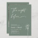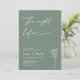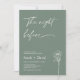 Simple rehearsal dinner invitation featuring an sage green background, a white modern calligraphy heading and line floral illustration. The couples photo appears in a sage frame on the back. Ideal for someone looking for a minimalist sage green rehearsal dinner invitation.
