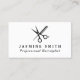 Eleganta minimalist visitkortar för hairstylists presenterar en para av stylist sax i svart, samman med hairstylistshårkammen, på en vitbakgrundsbakgrund med två linjer av beställnings- text i svart. Tillfoga ditt specificerar till baksidaen av kortet. Bakgrund på baksidaen är vit, och text är i modern svart skrivar.