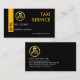 An all black cover is accentuated by a yellow vertical tab stripe which houses your phone contact and your prestigious name. Over at the top is a gold chauffeur taxi driver logo you can use. On the right is the business name "TAXI SERVICE" alongside a slogan caption option near the base of the card; You can change both captions to suit your own service needs.