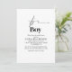 Klassisk, modern och så chic! Den minimalistiska "det är en pojke"-inbjudan är perfekt för dem som inte är kärlek. Designad med en elegant svartvit estetik tillför den en smula sofistikering till firande. Oavsett om du är värd för en brunch eller en intim sammankomst, anger inbjudan perfekten tonen.