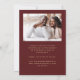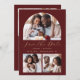 Det här enkla, minimalistiska Spara datumkortet har en 3-fotokollage, med ett bågformat foto överst och två mindre fyrkantiga foton vid grund. Mellan visas orden "Spara datum" i handskriftsskriptet elegant guld färgad, följt av parets namn, bröllop datum och stad i sans serif-teckensnitt på en burgundröd bakgrund. Lägg till ett fjärde foto med vågrät och ett mer detaljerat meddelande med ytterligare information på baksidan.