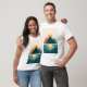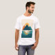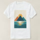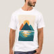 Den moderna t-shirt-skjortan är ett minimalistiskt exempel på berg med sol över ett stiliserat sjö. Dold geometrisk form och lugnande färg skapar en lugn ännu öga, perfekt för utomhusälskare eller fläkt av modern konst.