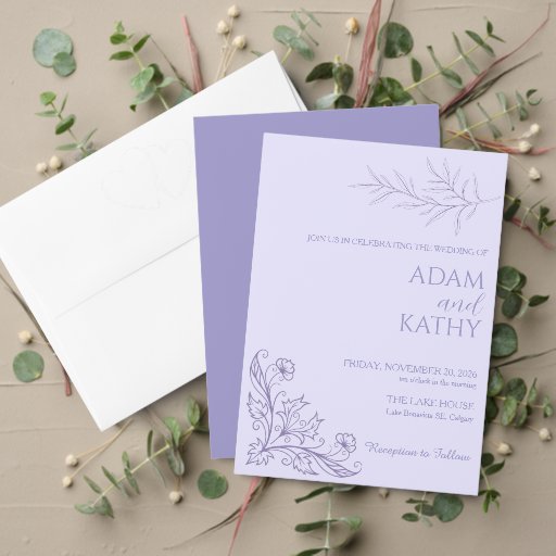 Vi presenterar denna eleganta lavendelfärgade botaniska bröllopsinbjudan - en drömlik, minimalistisk design med delikat handritad blomsterkonst i mjuka lavendelfärgade toner, perfekt för vår-, sommar- och trädgårdsbröllop.