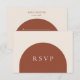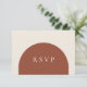 Förenkla din planeringsprocess med detta minimala och eleganta svarsbrev. Framsidan visar en fet "RSVP" i skrivstil inom en enkel terrakotta-båge mot en beige krämfärgad bakgrund. På baksidan kan gästerna skriva sitt namn, kryssa i om de med glädje accepterar eller beklagar att de inte kan komma, och om de accepterar, ange det totala antalet gäster i sin sällskap.
