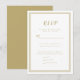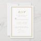 Det här moderna bröllop OSA-kortet är enkelt och elegant och har en minimalistisk utformning med en dubbla ram gräns i guld i färg i på en skarp vit bakgrund. Anpassa till datumet för bröllop och de markerade menyalternativen. Det finns platser som din gäst kan använda för att lägga till namn och svar för ett retursvar. Letteret och skriptet är i samma guld färg. Kortets baksida matchar färg som är fast. Se till att se våra matchande returetiketter i en separat lista: https://www.zazzle.com/z/ar5aniol?rf=238423044473770840