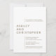 Elegant enkel minimal bröllopsinbjudan med ren typografi och en djärv modern sammansättning. Utformningen har detaljer i bröllop som är justerade mot förskjutna marginaler, vilket markerar parets namn som ett isolerat textblock. Utformningen är borttagen från främmande ornamentering och prioriterar därmed funktionalitet, balans och harmoni. Perfekt för par som omfattar ytterst enkelhet, elegans och stil. Kortets baksida är lämnat tom med en solid färg-bakgrund. Design finns i ett markerat urval av modernt färg och är lätt att personlig. en kommentar och sök hjälp med att anpassa eller anpassa sig. Vi ser fram emot att höra från och arbeta med er!