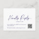 Inbjudan ska dina gäster svara med lätthet med hjälp av denna elegant OSA kort från vår dammiga blå bröllop-samling. Designat med delikata blommigtar för vattenfärg och utrymme för en QR-kod blandar detta kort traditionell charm med modern bekvämlighet. Gäster kan helt enkelt söka efter OSA online, skapar din planering smidigare och miljövänligare. Perfekt för snyggt bröllop med en liten bit romantik.