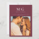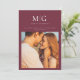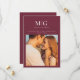 Minimalistisk Chic | Monogram Foto Spara Datum - är ett modernt, chic announcements/inbjudan med ett foto av Bruden och Brudgummen, och Bruden och Brudgummens monogram/bokstäver. Perfekt för Bruden och Brudgummen som älskar minimalistisk stil. Visas i merlot (burgunder), men du kan enkelt ändra bakgrundsfärgen för att matcha din bröllopps tema. Spara Datum är en del av en samling
