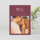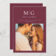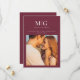 Minimalistisk Chic | Monogram Foto Spara datum - är ett modernt, chic tillkännagivande/inbjudan med ett foto av bruden och brudgummen, och bruden och brudgummens monogram/bokstavsinitialer. Perfekt för bruden och brudgummen som älskar minimalistisk stil. Visas i merlot (burgunder), men du kan enkelt ändra bakgrundsfärgen för att matcha ditt bröllopstema. Spara datum är en del av en samling
